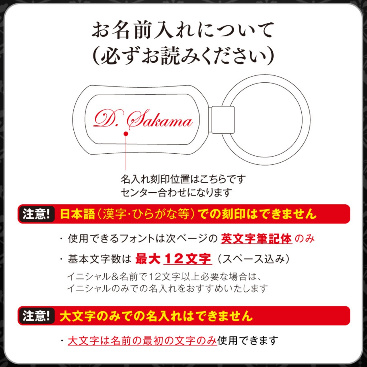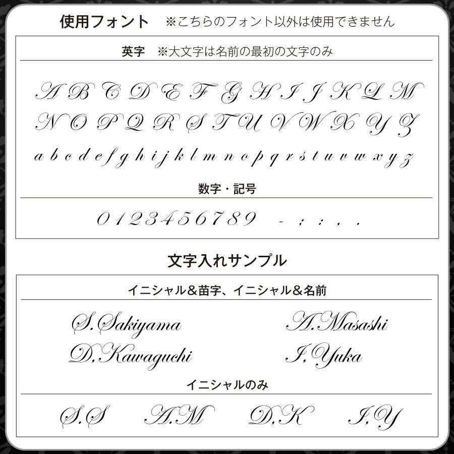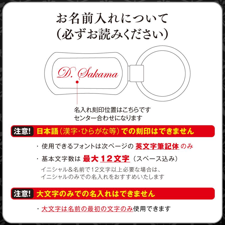 【重要】名入れは上部商品紹介画像にて詳しくご説明しております。最大12文字、アルファベット、数字のみ刻印可、アルファベット大文字は文頭のみ使用可